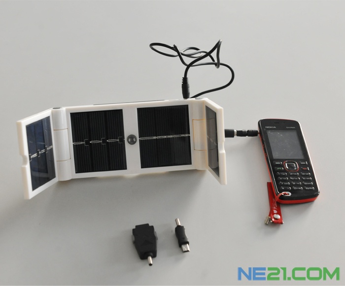 日前,2011中國國際綠色創(chuàng)新技術(shù)產(chǎn)品展在廣州開幕,展會上中國綠色能源企業(yè)英利集團的研發(fā)人員展示一款名為“世界杯便攜式太陽能充電器”的產(chǎn)品,這款由4塊太陽能電池板構(gòu)成的充電器在太陽光下可以為手機等數(shù)碼產(chǎn)品充電。